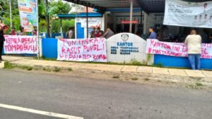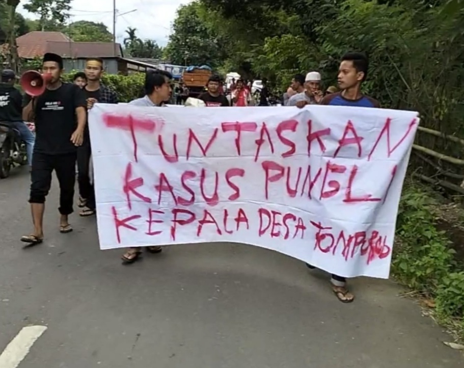 Tampak, massa aksi juga membentangkan sejumlah spanduk yang bertuliskan, “Tangkap dan adili Kades Tompobulu yang melakukan pungli”.
