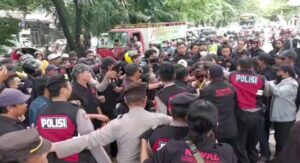 Sempat terjadi saling dorong antara pengunjukrasa dan pihak Kepolisian yang mengamankan aksi unjukrasa tersebut saat massa melakukan aksi bakar ban.