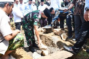 Usai salat Jum’at berjamaah, Pangdam didampingi unsur Forkopimda Kabupaten Maros, melaksanakan peletakan batu pertama pembangunan gedung Panti Asuhan Darul Istiqamah Pusat Kabupaten Maros. (Budhy)