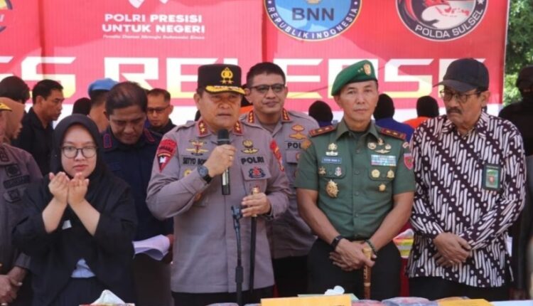 JEJAKHITAM.COM (MAKASSAR) – Jajaran Polda Sulsel menggelar Press Release pemusnahan barang bukti narkotika yang berhasil diungkap oleh Direktorat Reserse Narkoba Polda Sulsel dalam kurun waktu 5 (lima) bulan terakhir.