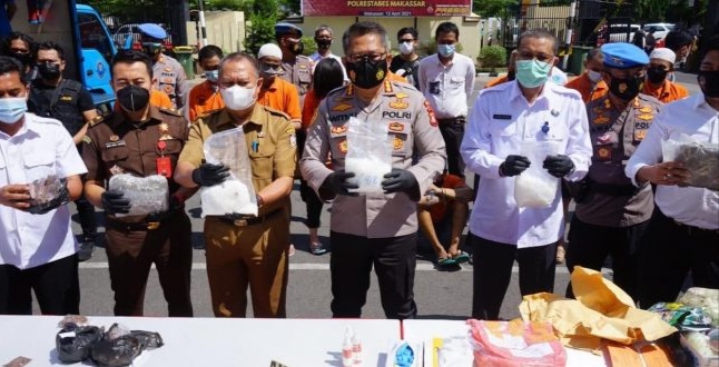 Pemusnahan barang bukti narkotika tersebut dilaksanakan di halaman Polrestabes Makassar, Senin (12/04/2021), yang dipimpin langsung oleh Kapolrestabes Makassar Kombes Pol. Witnu Urip Laksana, SIK, serta perwakilan Kepala BNNP Sulsel, Dir Narkoba Polda Sulsel, Kabid Labfor Polda Sulsel, Kasubbid Narkoba, Kepala Kejaksaan Negeri Makassar, Ketua Pengadilan Negeri Makassar KA Kesbangpol Pemkot Makassar, Kasat Narkoba Polrestabes Makassar serta Kapolsek Jajaran Polrestabes Makassar.