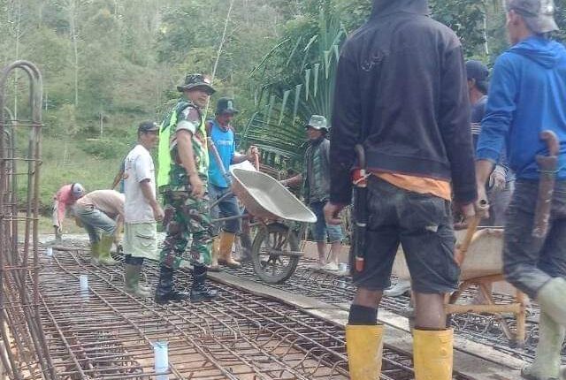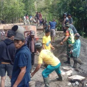 JEJAKHITAM.COM (SINJAI) – Warga Desa Barambang bersama Babinsa Koramil 1424-06/Sinjai Borong Serka Syamsuddin, menggelar kerja bakti pengecoran jembatan di Liusirie Dusun Bontomanai, Desa Barambang, Kecamatan Sinjai Borong, Kabupaten Sinjai, Minggu (24/09/2023).