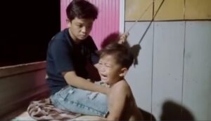 “Berhenti ko menangis”, ucap pria itu sambil mencubit lengan si bocah. Karena tak kunjung diam, pemuda itu kembali menjambak rambut si anak dan membungkam wajahnya di sela-sela paha pemuda tersebut sehingga si anak kesulitan bernafas.